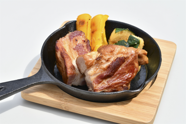 和豚もちぶたの味わい豊かなスペアリブを、専用のスパイスを使ってじっくりと漬け込み、香り高く燻製をして仕上げた逸品。骨付き肉のワイルドな旨みと深みのあるスモーキーな香りが特徴。