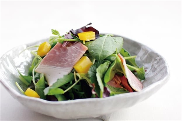 和豚もちぶたの肩肉を使ったショルダーベーコン。バラ肉のベーコンに比べて脂身が少なく、あっさりしているのが特徴。乾塩法という豚肉に塩を直接擦り込む昔ながらの製法で、肉の質量に合わせて最適な塩の量を見極めて擦り込み、時間をかけて熟成させています。
