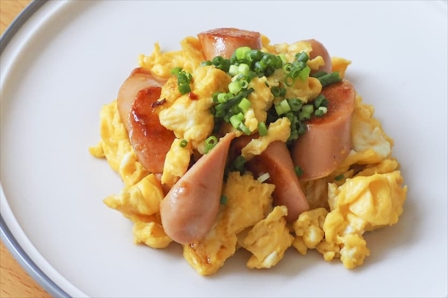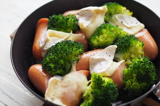 フライパンに5ミリ程の水を入れ、そこにウィンナを袋から出し、温めます。水分がなくなったら、2〜3分程度乾煎りします(水が多かった場合は蓋などを使い捨ててください)。