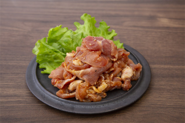 豚肉(国産)、タレ(醤油(国内製造)、砂糖、りんご果汁、おろしにんにく、洋なし果汁、いりごま、野菜エキス、レモン果汁、唐辛子、マスタード、豆板醤、コショウ、乾燥玉ねぎ/増粘剤(加工デンプン)、香料、酸化防止剤(V.C)、パプリカ色素、調味料(アミノ酸等)、(一部に小麦・ごま・大豆・りんごを含む)