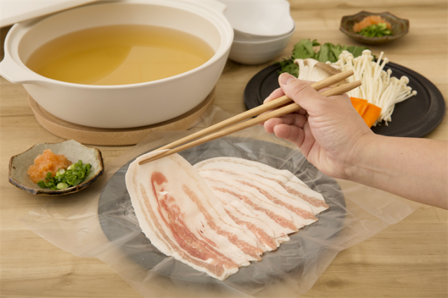 しゃぶしゃぶの厚さは1〜2mmになります。100gずつシートで挟んでいるので、お肉同士の重なりが少なく、お箸で簡単に取ることができます。