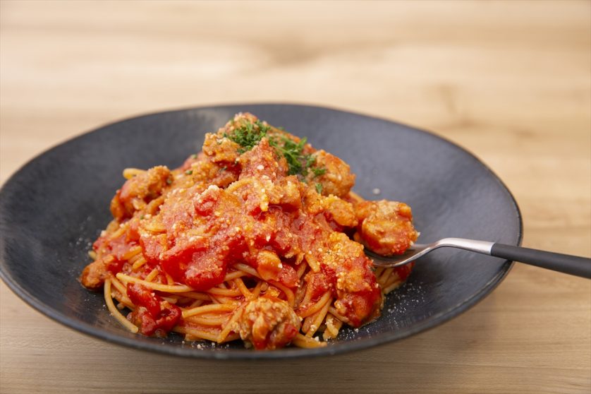 包丁要らず&フライパンひとつで出来る簡単レシピ。粗挽き生ソーセージの旨みとトマトの酸味がパスタ全体にしっかり絡み、濃厚で食べ応えのある味わいに仕上がります。さらに、仕上げに粉チーズやパセリを散らせば、彩りも良く、レストランのような一皿に。調理も後片付けも簡単なので、忙しい日のランチや夕食にぴったりです。